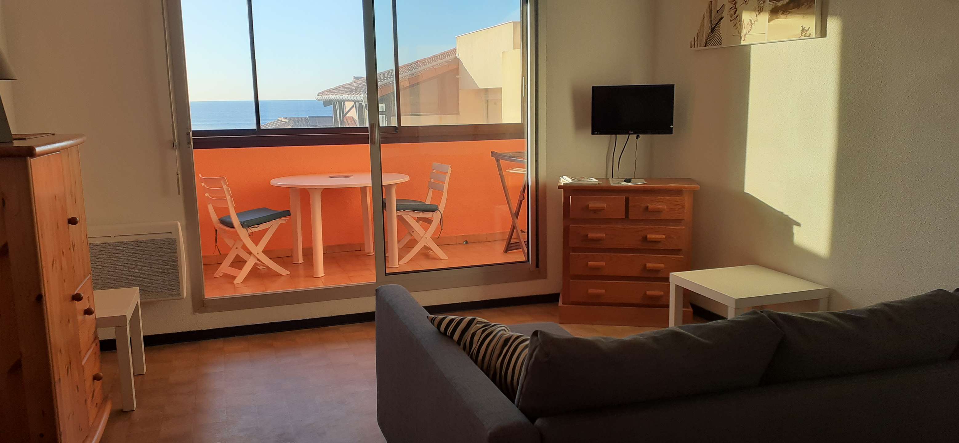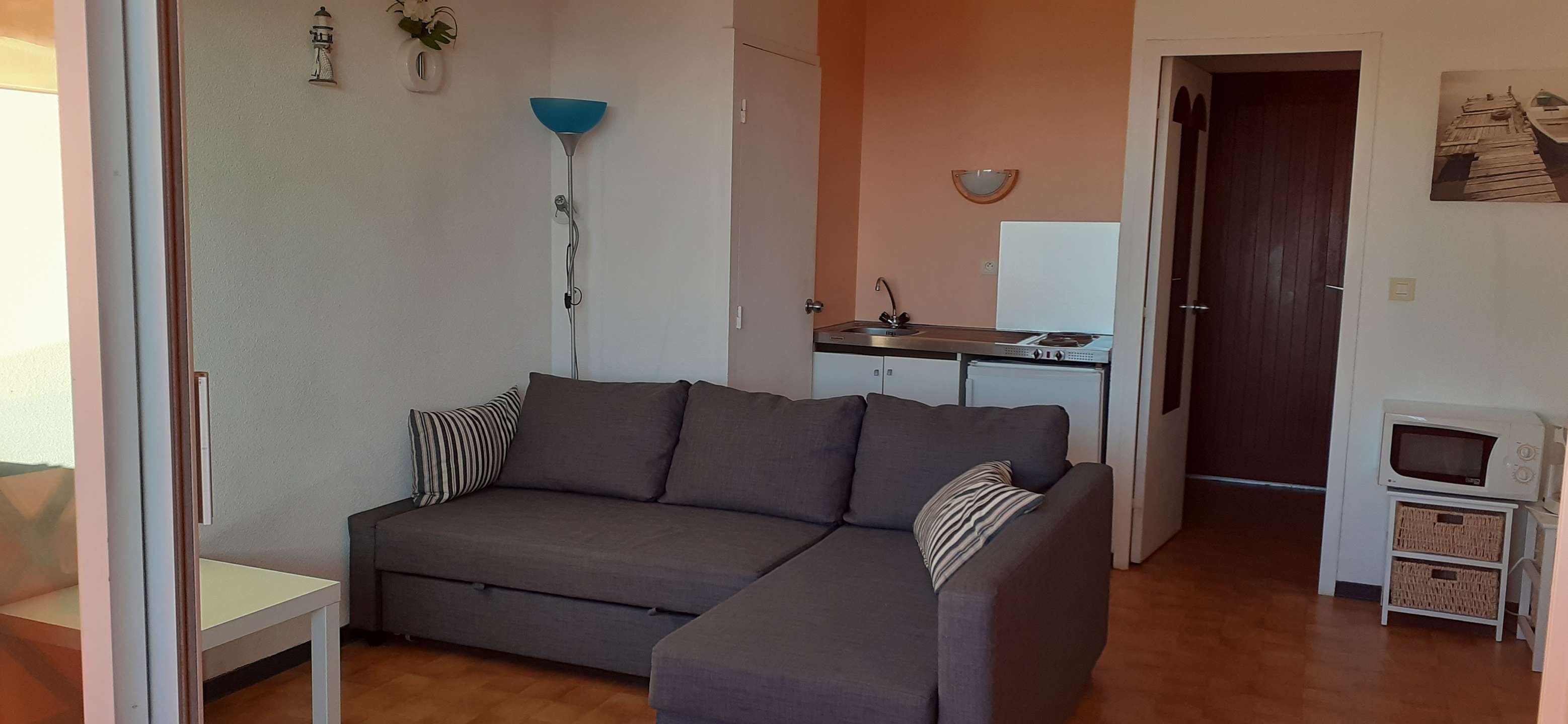 Deux pièces cabine au rdc Entrée avec lits superposés et placard coulissant. Chambre avec lit double, salle d'eau avec wc, cuisinette et salon ouvrant sur une loggia orientée au sud. Appartement tr...
