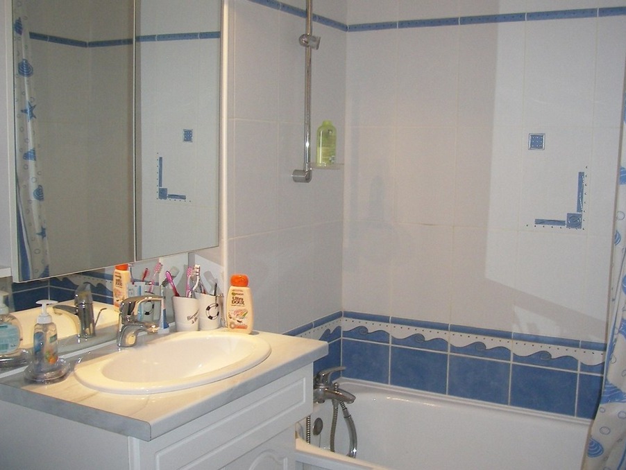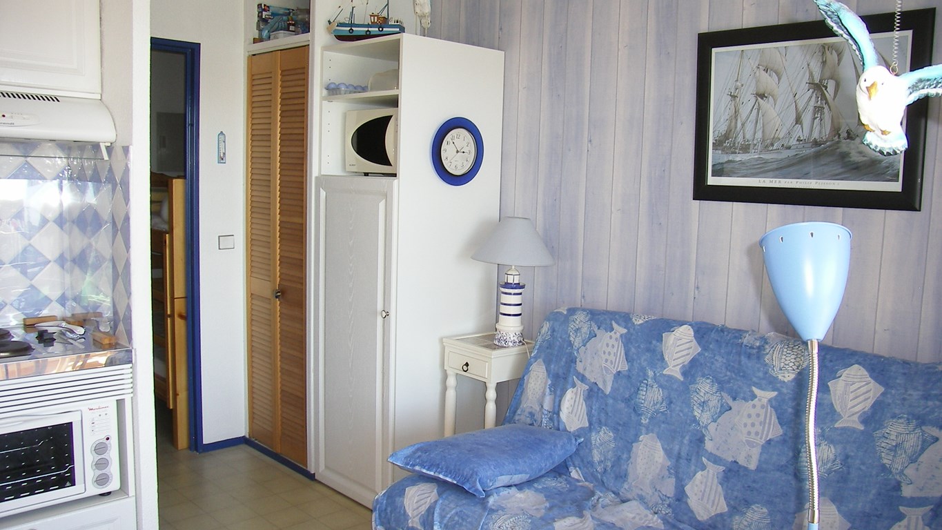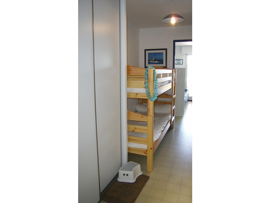 Deux-pièces-cabine, 2ème étage, lits superposés et placard, chambre avec lit double, salle de bains avec wc, coin cuisine et séjour (canapé convertible) ouvrant sur une agréable terrasse au sud et fermée par des baies vitrées coulissante. Accès gratuit à piscine, tennis Le linge de maison n'est pas inclus mais peut vous être proposé à la location au besoin. Ménage de fin de séjour sus En période de froid un supplément vous sera demandé pour la participation au chauffage