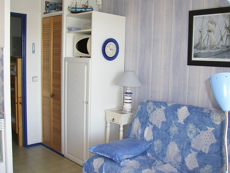 Deux pièces composé d'un séjour avec cuisinette bien équipée, donnant sur une terrasse exposée a l'ouest avec vue sur la mer. Table et chaises de jardin. Une chambre donnant sur une salle d'eau fer...
