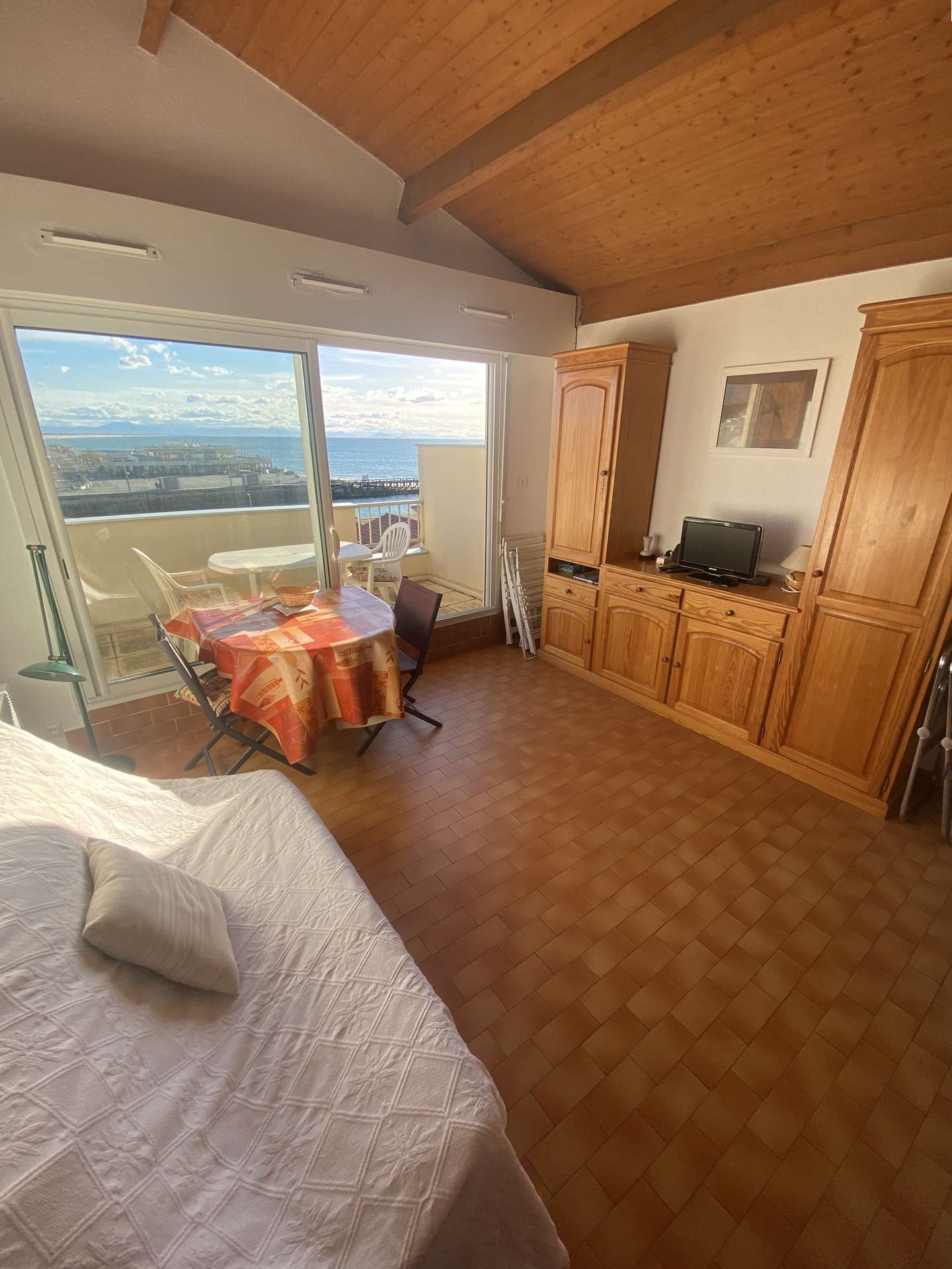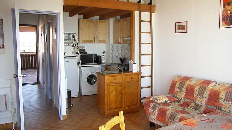 Studio cabine, 2eme étage, entrée avec lits superposés et placard, mezzanine avec lit double, salle d'eau, wc, cuisinette et salon ( canapé convertible ) sur une terrasse avec une jolie vue sur le canal et le port. Le linge de maison (draps et serviettes) n'est pas inclus dans la réservation mais peut vous être proposé à la location au besoin. (tarif : nous consulter) Ménage de fin de séjour 60€ En période de froid un supplément vous sera demandé pour la participation au chauffage