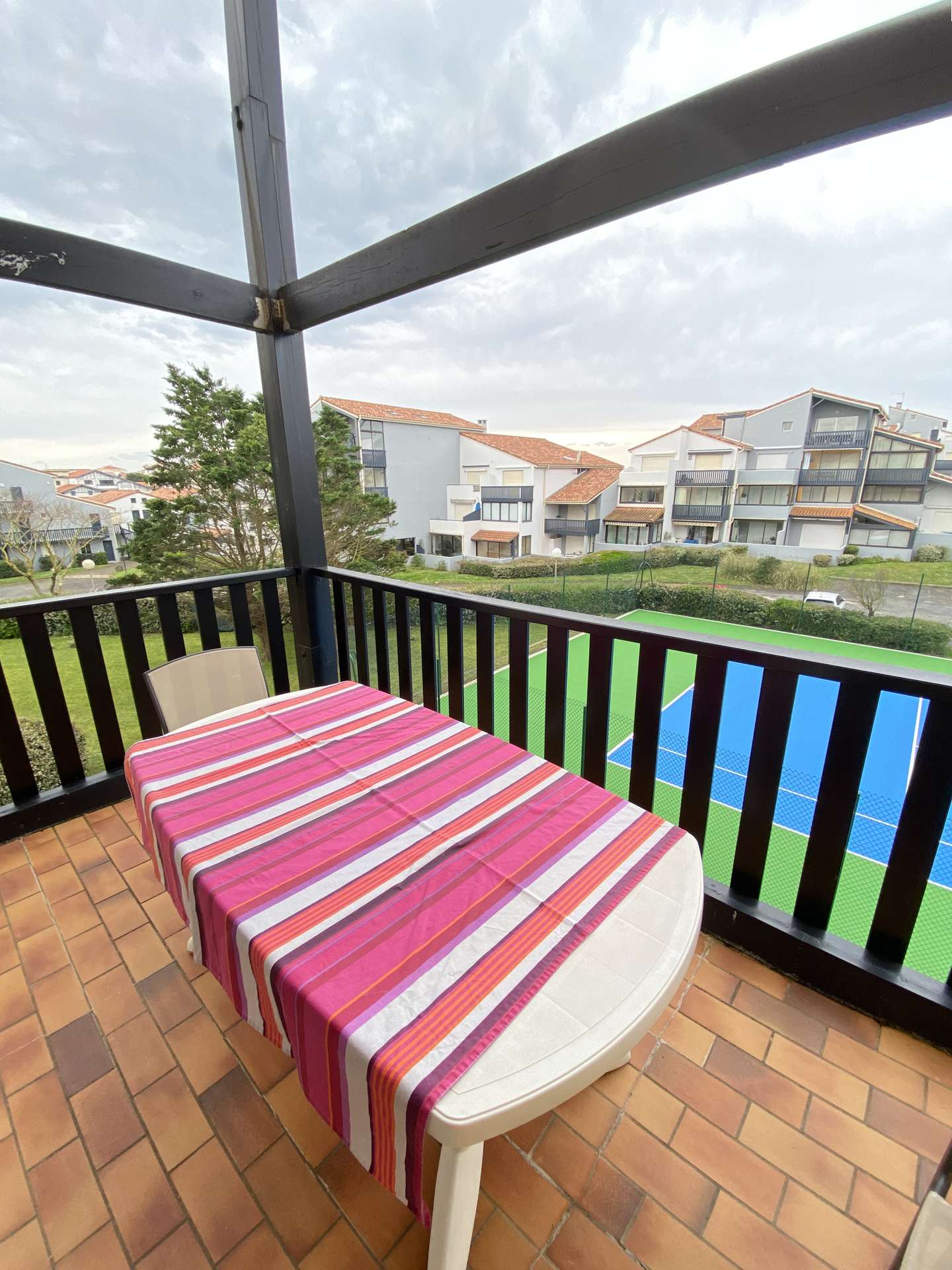 Vue sur les terrains de tennis, jardins les terrasses de notre dame, parking et canal. Accès gratuit à la piscine, aux tennis, et place de stationnement privée.